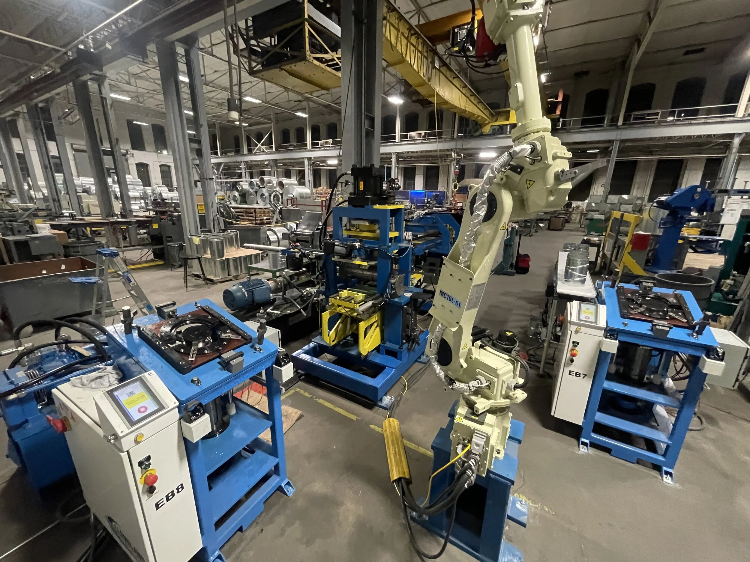 Industrial robotics and manufacturing equipment set up in a factory