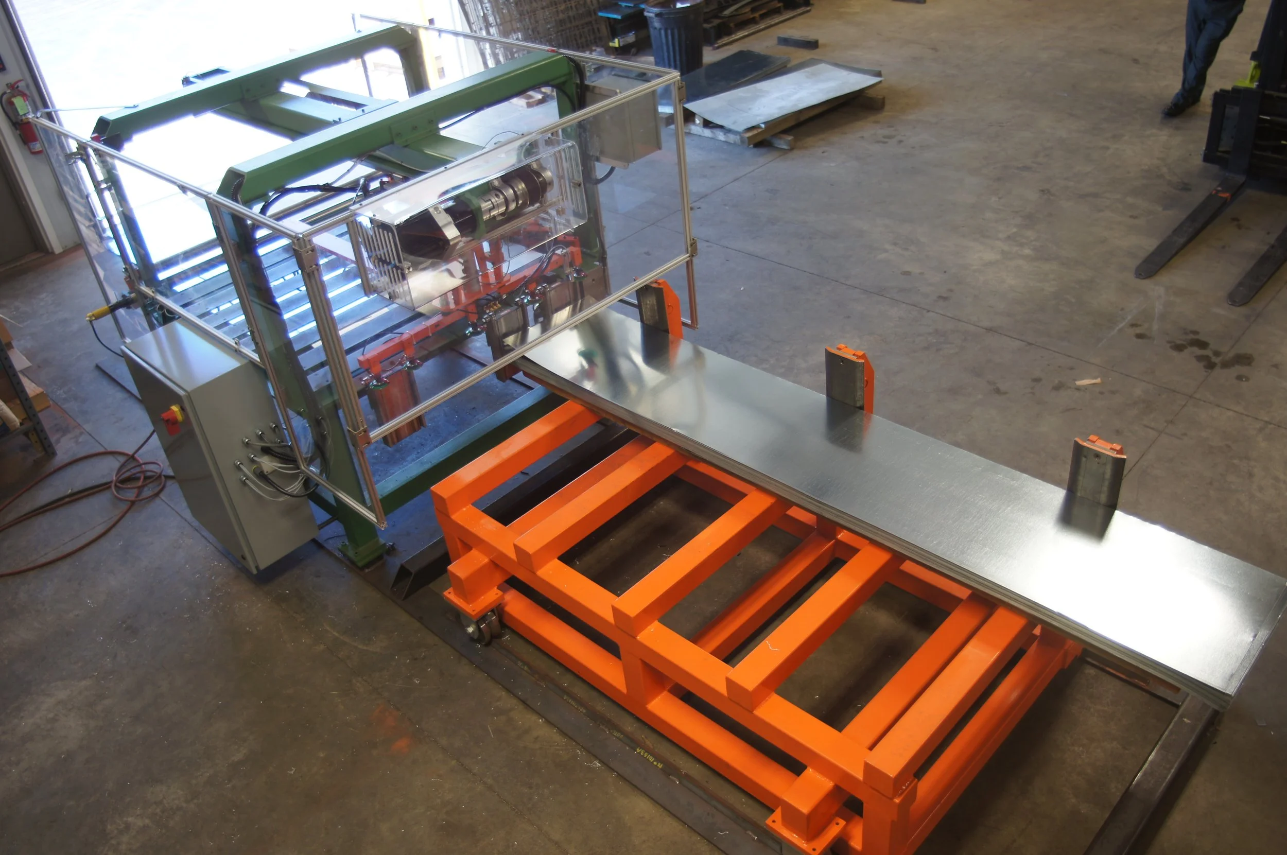 Automated industrial machine with a long metal conveyor and orange pallet underneath, situated in a workshop with concrete floor and tools around.